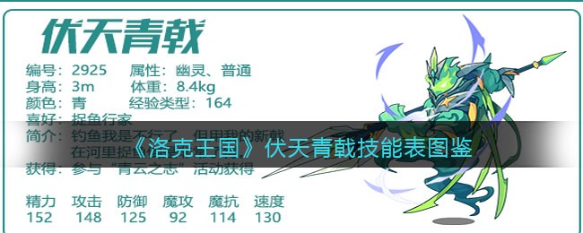 《洛克王国》是一款轻松好玩的休闲类手游,游戏中拥有海量的宠物精灵,伏天青戟怎么样,厉害吗?下面易采游戏网小编给大家带来了《洛克王国》伏天青戟技能表图鉴介绍,想要知道该宠物信息的小伙伴速来围观吧!