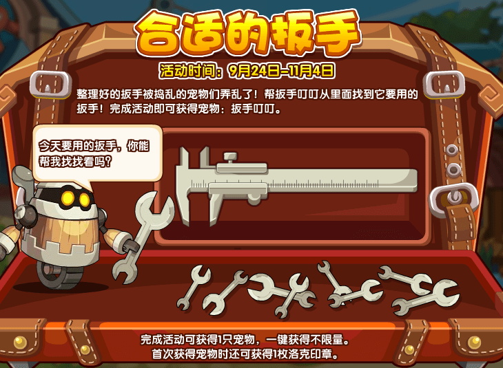 优秀的修理小能手当然需要拥有一把合适的修理工具!但是整理好的扳手被捣乱的宠物们弄乱了!帮扳手叮叮从里面找到它要用的扳手!完成活动即可获得宠物:扳手叮叮。