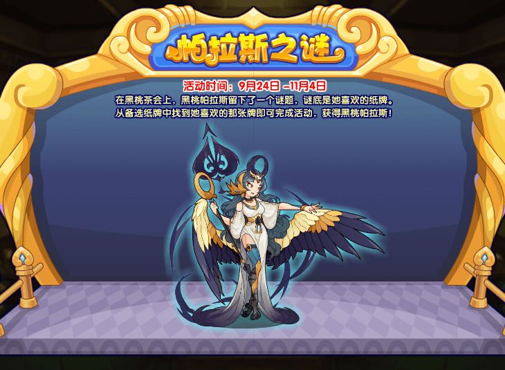 在黑桃茶会上,黑桃帕拉斯留下了一个谜题,谜底是她喜欢的纸牌。从备选纸牌中找到她喜欢的那张牌即可完成活动,获得黑桃帕拉斯!