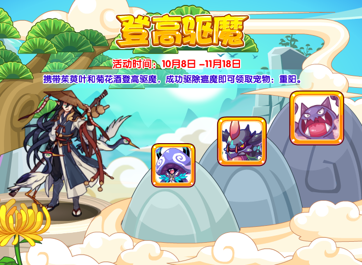 携带茱萸叶和菊花酒登高驱魔,成功驱除瘟魔即可领取宠物:重阳。