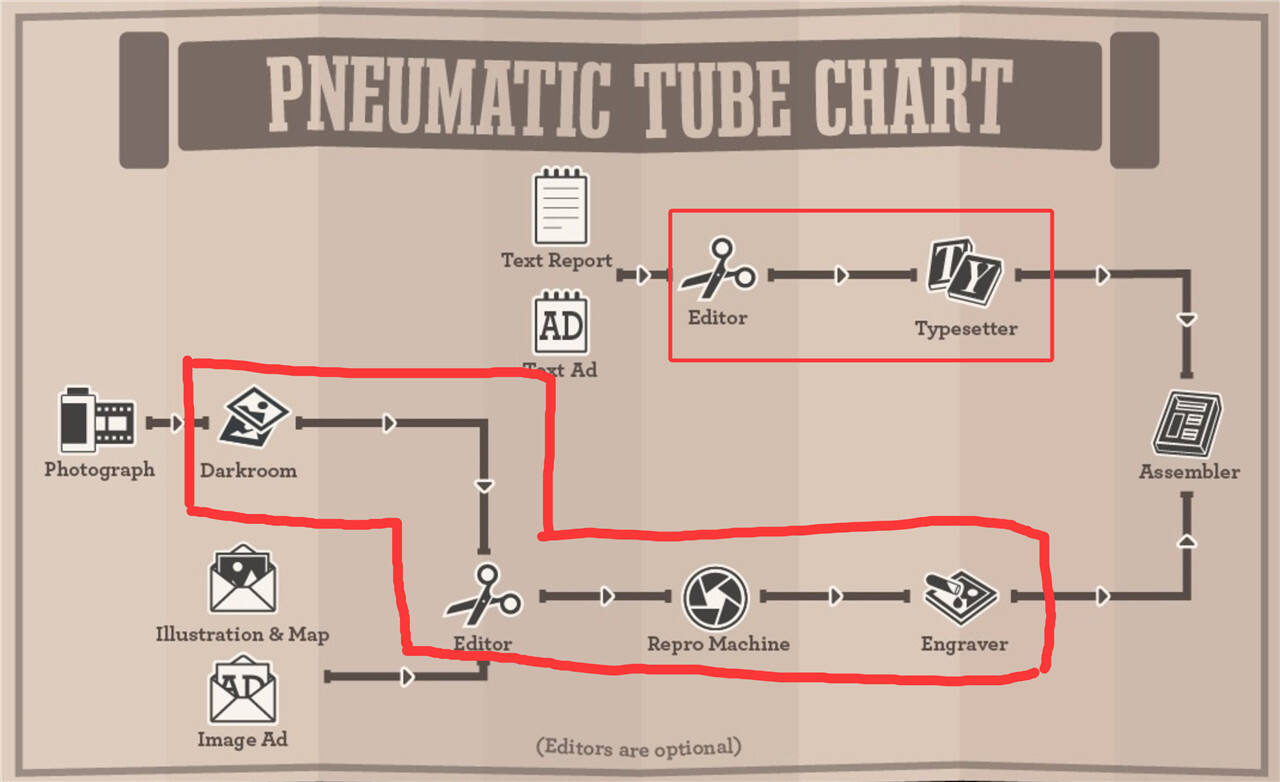 因为排版和组装工作量最大,所以用气动管连接每个排版桌右边和组装桌左边,让小人少走路