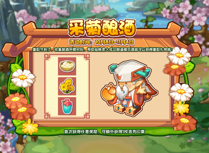 重阳节到了,收集酿酒所需材料,帮助仙桃老人成功酿造菊花酒就可以获得重阳礼物哦!