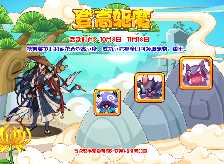 携带茱萸叶和菊花酒登高驱魔,成功驱除瘟魔即可领取宠物:重阳。