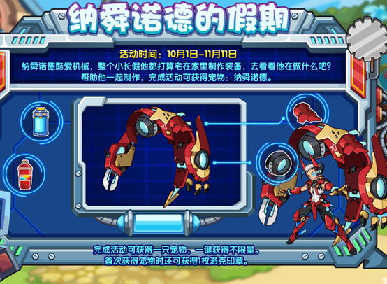 纳舜诺德酷爱机械,整个小长假他都打算宅在家里制作装备,去看看他在做什么吧?帮助他一起制作,完成活动可获得宠物:纳舜诺德。