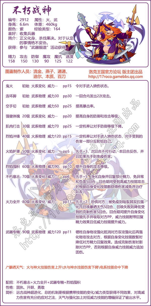 洛克王国不朽战神技能配招方面推荐用不朽意志+火力全开+武器专精+烈焰囤积。远古战神超进化,总的机制是根据携带技能的变化/威力类型获得不同效果,对高威力伤害有充分的应对之法,天气与强化加上对低威力技能的增幅保证了输出水平。