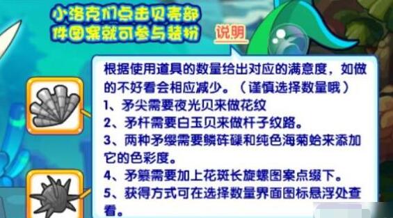 看了看手中的鱼矛非常之单调,小洛克们帮我收集不同款式的贝壳。我用来装饰下鱼矛,要符合我气质的贝壳哦。