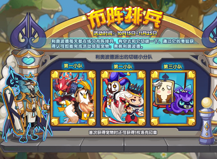 利奥波德每天都在练习布阵排兵,有空去和它切磋一下,通过它的考验获得认可即能完成活动领取宠物:黑桃利奥波德。