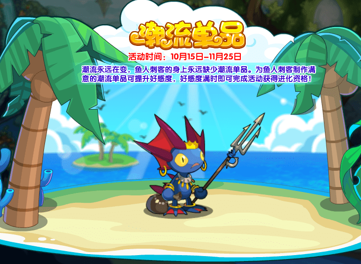 潮流永远在变,鱼人刺客的身上永远缺少潮流单品。为鱼人刺客制作满意的潮流单品可提升好感度,好感度满时即可完成活动获得进化资格!