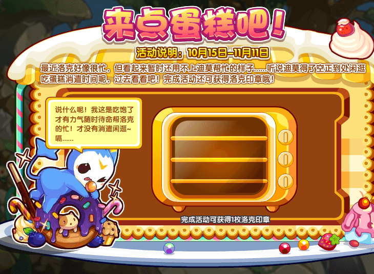 最近洛克好像很忙,但看起来暂时还用不上迪莫帮忙的样子……听说迪莫得了空正到处闲逛吃好吃的蛋糕消遣时间呢,过去看看吧!完成活动还可获得洛克印章哦!