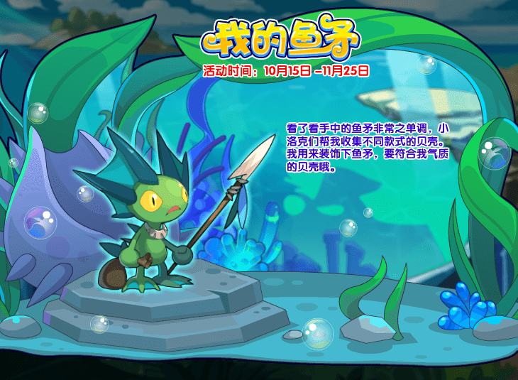 看了看手中的鱼矛非常之单调,小洛克们帮我收集不同款式的贝壳。我用来装饰下鱼矛,要符合我气质的贝壳哦。