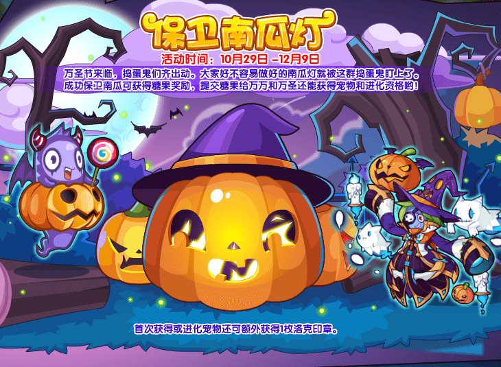 成功保卫南瓜可获得糖果奖励,提交糖果给万万和万圣还能获得宠物和进化资格哟!