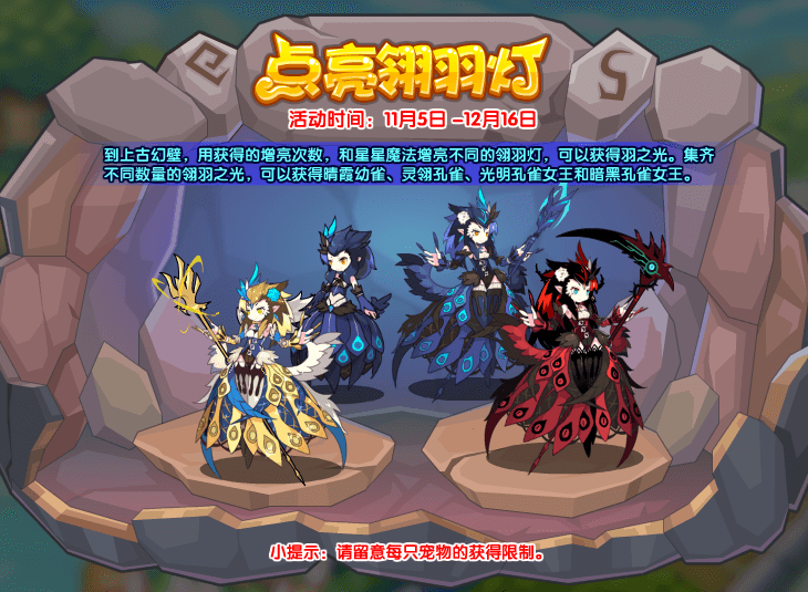 活动获得:晴霞幼雀,灵翎孔雀,光明孔雀女王和暗黑孔雀女王
