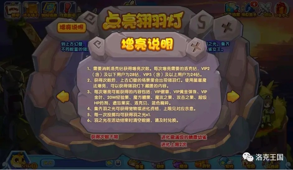 3、每次增亮可能获得的内容包括:VIP徽章、VIP黄金弹珠、VIP金叶、20W经验果、魔方糖果、魔攻之果、攻击之果、超级HP药剂、遗忘果实、洛克贝、蓝色精粹。
