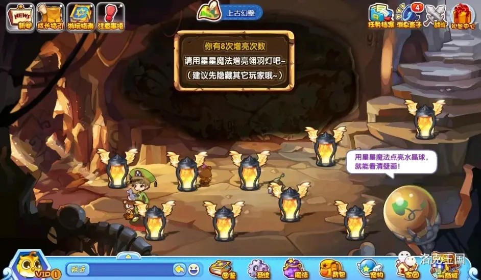 2、获得次数后,上古幻壁的场景里会出现翎羽灯。使用星星魔法增亮,可以获得翎羽灯下藏匿的内容。