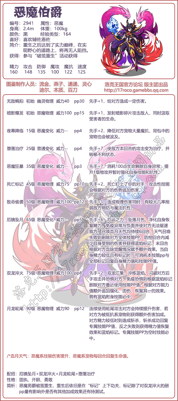 《洛克王国》游戏中恶魔伯爵技能配招方面推荐用厄镜坠月+双龙淬火+月龙轮尾+堕落治疗。恶魔男爵破茧重生为恶魔伯爵,重生后依旧是在"标记”上下功夫,标记除了对双龙淬火的删pp量有影响外是否有其他加成效果还有待测试。