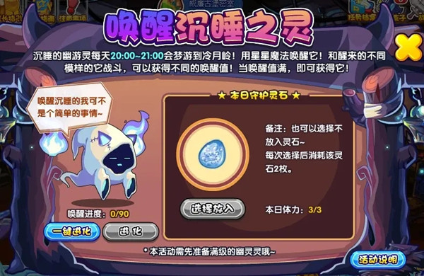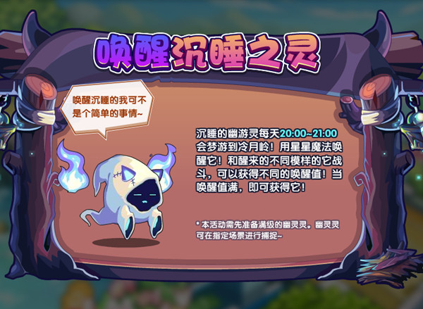 沉睡的幽游灵每天20:00~21:00会梦游到冷月岭!用星星魔法唤醒它!和醒来的不同模样的它战斗,可以获得不同的唤醒值!当唤醒值满,即可获得它!