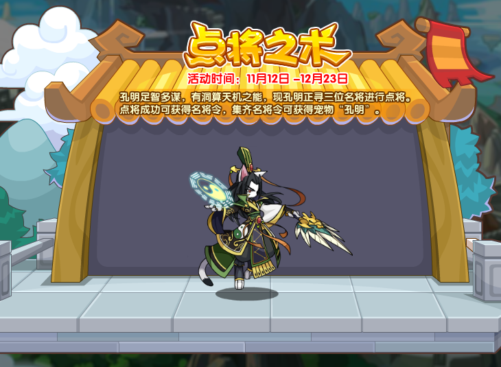 孔明足智多谋,有洞算天机之能,现孔明正寻三位名将进行点将。点将成功可获得名将令,集齐名将令可获得宠物“孔明”。