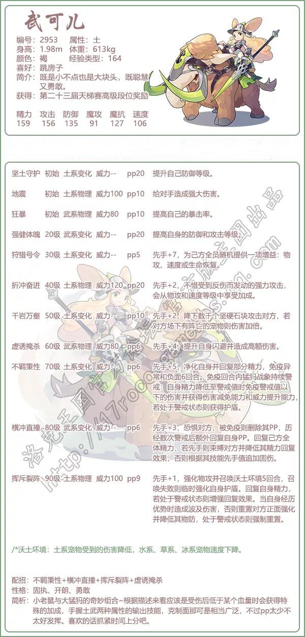 简析:小老鼠与大勐犸的奇妙组合~根据描述来看应该是受伤后低于某个血量时会获得特殊的加成,手握土武两种属性的输出技能,克制面那可是相当广泛,不过pp太少不太好发挥。喜欢的话抓紧时间上分吧。