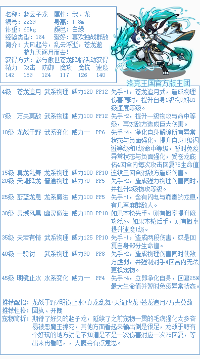 《洛克王国》游戏中宠物精灵非常多,【赵云子龙】是即将上线的宠物,性格推荐固执、开朗。技能搭配推荐龙战于野/明镜止水+青龙乱舞+天谴降龙+苍龙追月/万夫莫敌。