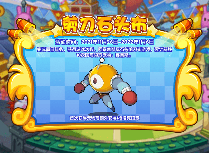 完成每日任务,获得游戏次数,同赛普斯玩石头剪刀布游戏,累计获胜10次即可领取宠物:赛普斯。