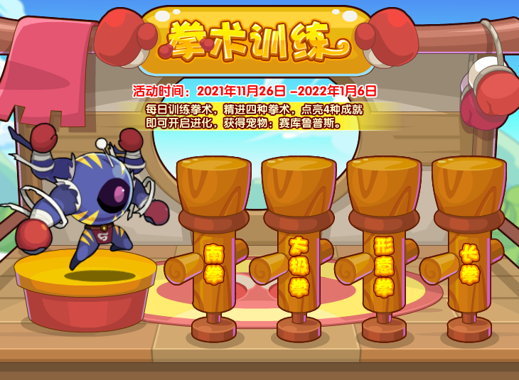 每日训练拳术,精进四种拳术,点亮4种成就即可开启进化,获得宠物:赛库鲁普斯。