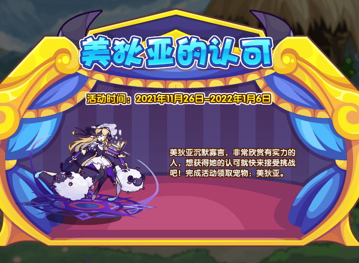 美狄亚沉默寡言,非常欣赏有实力的人,想获得她的认可就快来接受挑战吧!完成活动领取宠物:美狄亚。(参与一键获得和开启考验需要vip等级达到vip2及以上)