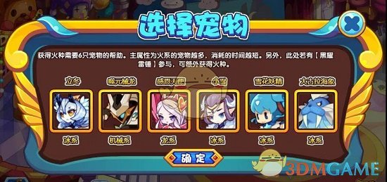 从火焰中获得火种需要6只宠物的帮助。其中主属性为火系的宠物越多,消耗的时间越短。