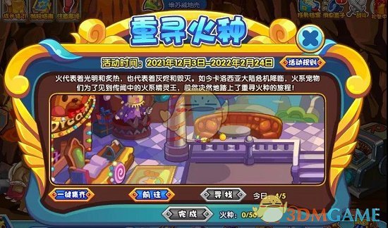 从火焰中获得火种需要6只宠物的帮助。其中主属性为火系的宠物越多,消耗的时间越短。此外,每个场景若有特殊宠物帮助,还可额外获得火种。如图中所示,小贝找到的火焰,选择宠物时如果有宠物黑耀雷锤参与,倒计时结束后,将会获得额外火种。(特殊宠物会在后续更新活动中陆续放出)