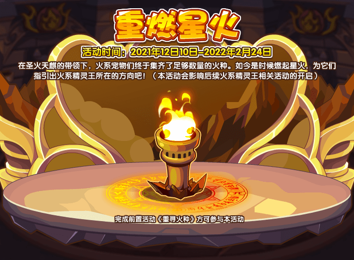 在圣火天麒的带领下,火系宠物们终于集齐了足够数量的火种。如今是时候燃起星火,为它们指引出火王所在的方向吧!(本活动会影响后续火系精灵王相关活动的开启)