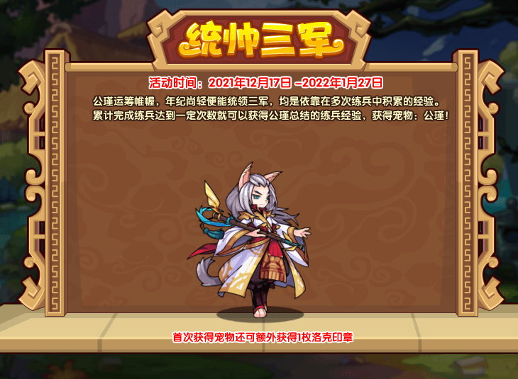 公瑾运筹帷幄,年纪尚轻便可统领三军,均是依靠在多次练兵中积累的经验。累计完成练兵达到一定次数就可以完成活动,获得宠物:公瑾!