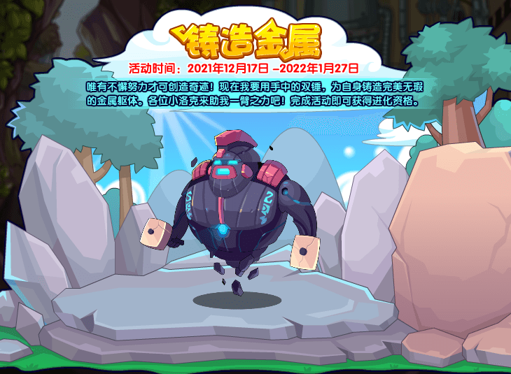 唯有不懈努力才可创造奇迹!现在我要用手中的双锤,为自身铸造完美无瑕的金属躯体。各位小洛克来助我一臂之力吧!完成活动即可获得进化资格。