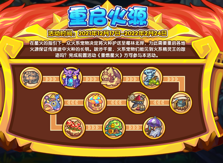 在星火的指引下,众火系宠物决定将火种护送至椰林北岸,为此需要重启各地火源,保证传递途中火种的长明。跋涉千里,火系宠物们能见到火系精灵王的踪迹吗?