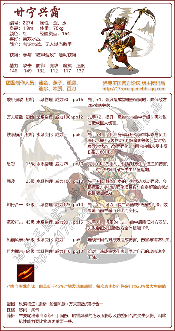 洛克王国兴霸可通过2021年12月17日-2022年1月27日参加【招兵买马】活动获取,编号 2274;属性武、水;身高 1.9m;体重 70kg;经验类型 164。