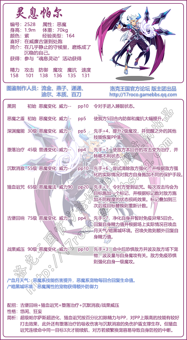 简析:超级帕尔萨斯超进化,猎血诅咒按百分比扣除精力与PP,对PP上限高的技能有较好打击效果,此外还有堕落治疗的吸收伤害与沉默消寂的免伤护盾支撑生存。但猎血诅咒连续命中同一目标3次才能续航,对方若频繁换宠容易导致自身防控的中断。