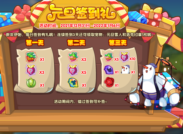 新年伊始,每日签到有礼哦!连续签到3天还可领取宠物:元旦雪人和洛克印章1枚哦~