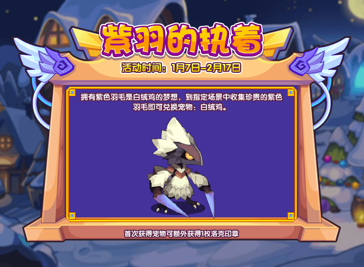 拥有紫色羽毛是白绒鸡的梦想,到指定场景中收集珍贵的紫色羽毛即可兑换宠物:白绒鸡。