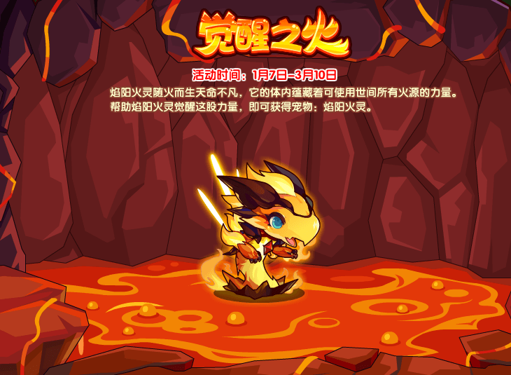 焰阳火灵随火而生天命不凡,它的体内蕴藏着可使用世间所有火源的力量。帮助焰阳火灵觉醒这股力量,即可获得宠物:焰阳火灵。(本活动需要完成系列前置活动《重启火源》才可参与。)