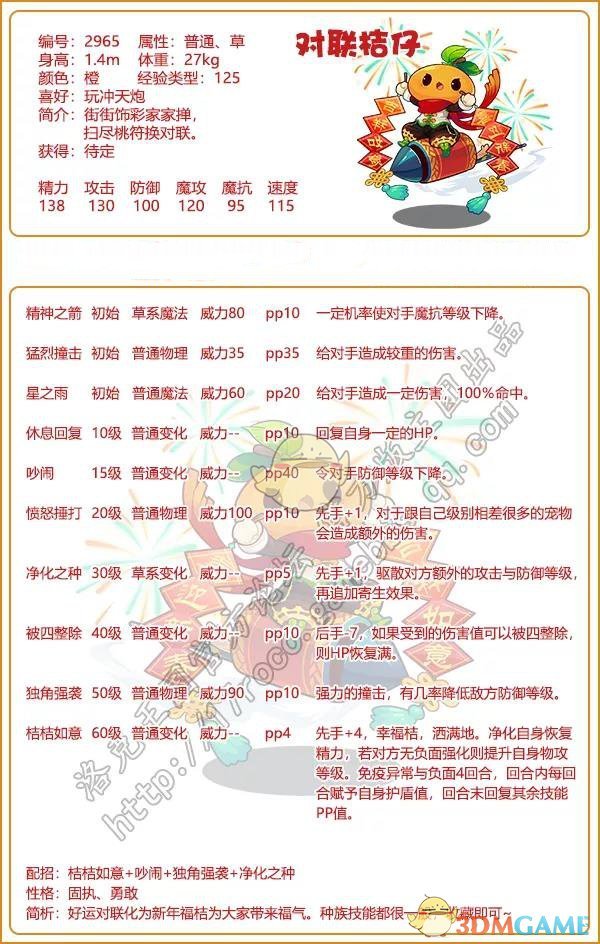 4、简析:好运对联化为新年福桔为大家带来福气。种族技能都很一般,收藏即可~