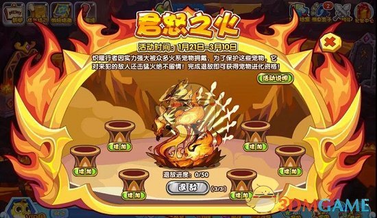 《洛克王国》游戏中在2022年1月21日-3月10日参与【君怒之火】活动,点击煜晖君主会出现熟悉的活动界面。每天有3次退敌次数,退敌成功可积累进度。当进度满时即可获得煜晖君主进化资格。