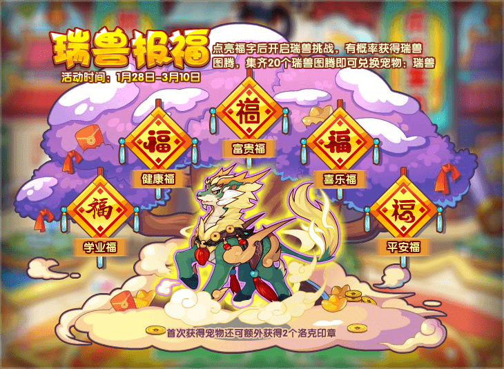 点亮福字后开启瑞兽挑战,有概率获得瑞兽图腾,集齐20个瑞兽图腾即可兑换宠物:瑞兽。