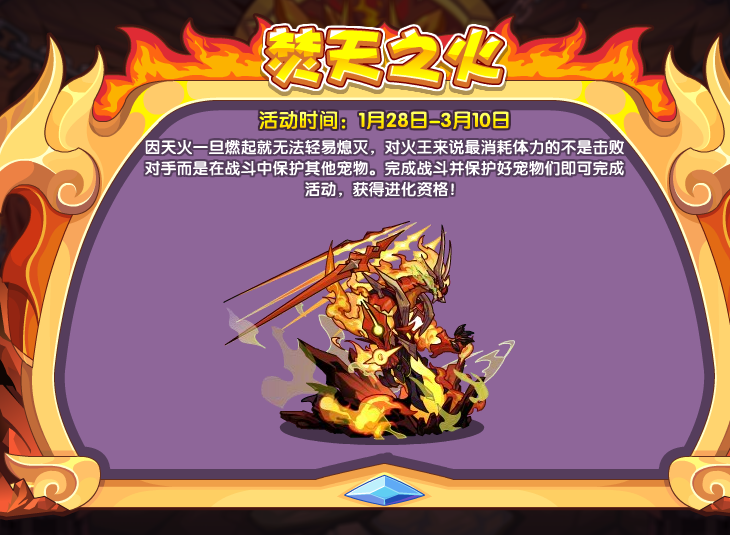 因天火一旦燃起就无法轻易熄灭,对火王来说最消耗体力的不是击败对手而是在战斗中保护其他宠物。完成战斗并保护好宠物们即可完成活动,获得进化资格!