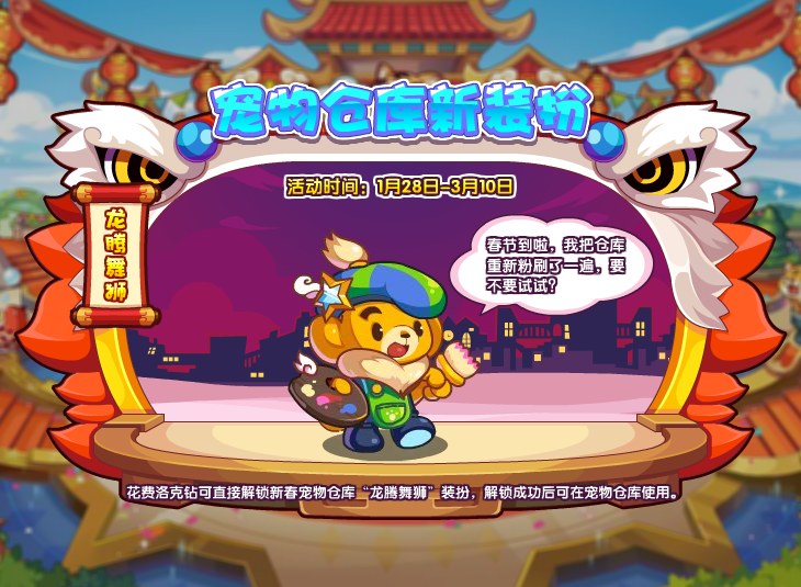 花费洛克钻可直接解锁新春宠物仓库“龙腾舞狮”装扮,解锁成功后可在宠物仓库使用。
