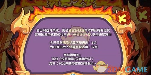 5、当5点体力消耗完毕后,就会结算今日的进度。今日进度=营救宠物获得的进度+迎击敌人获得的进度。如果今日体力并未消耗完毕,则不会触发结算,今日所获的两种进度将随体力重置而清空。所以一定要记得将5点体力都消耗完毕哦!