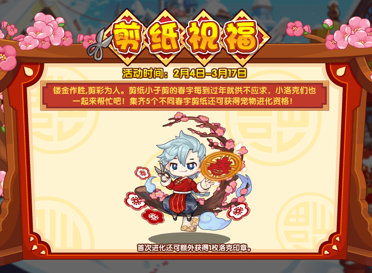 镂金作胜,剪彩为人。剪纸小子剪的春字每到过年就供不应求,小洛克们也一起来帮忙吧!集齐5个不同春字剪纸还可获得宠物进化资格!