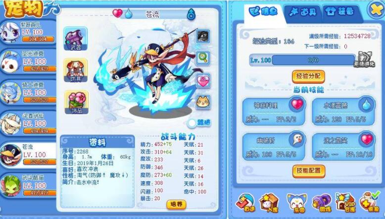 技能2:击水中流:汲取对方全阵10%生命依次分配给损失血量多的宠物,并吸取少许对方场上宠物双防值。