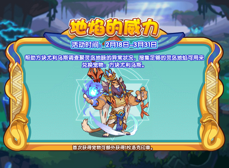 听说最近聚灵岛地脉有异常状况,帮助方块尤利乌斯调查一下吧!搜集足够的灵岛地焰可用来兑换宠物:方块尤利乌斯。感兴趣的小洛克们不要错过了哦!