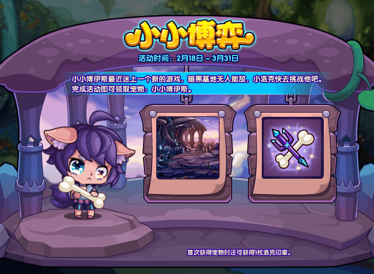 小小博伊斯最近迷上一个新的游戏,暗黑基地无人能敌,小洛克快去挑战他吧。完成活动即可领取宠物:小小博伊斯!