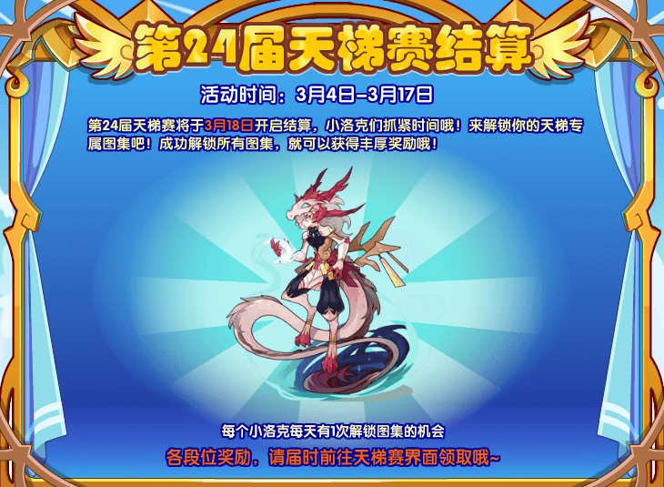 第24届天梯赛将于3月18日开启结算,小洛克们抓紧时间哦!来解锁你的天梯专属图集吧!成功解锁所有图集,就可以获得丰厚奖励哦!