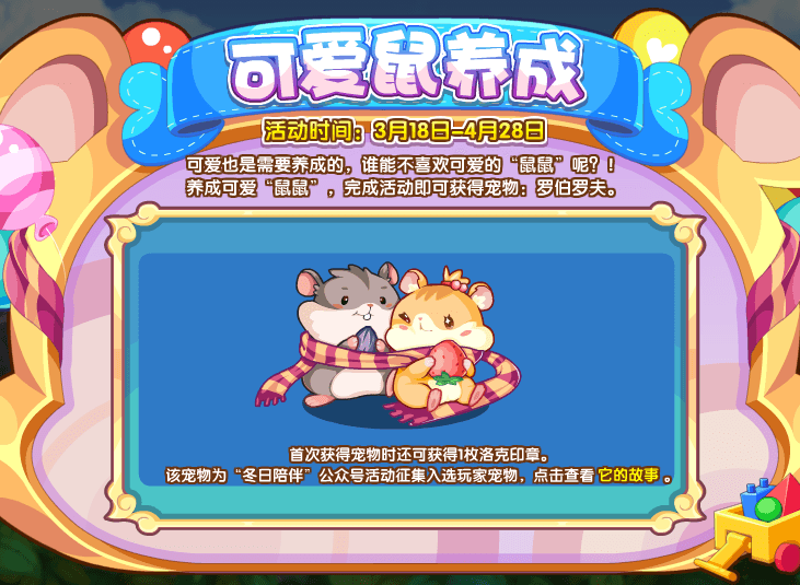 可爱也是需要养成的,谁能不喜欢可爱的“鼠鼠”呢?!养成可爱“鼠鼠”,完成活动即可获得宠物:罗伯罗夫。(该宠物为“冬日陪伴”公众号活动征集入选玩家宠。)