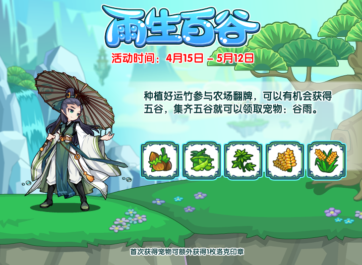 种植好运竹参与农场翻牌,可以有机会获得五谷,集齐五谷就可以领取宠物:谷雨。